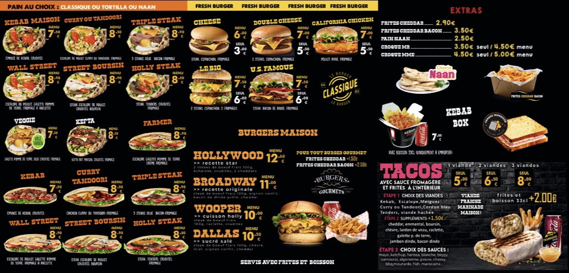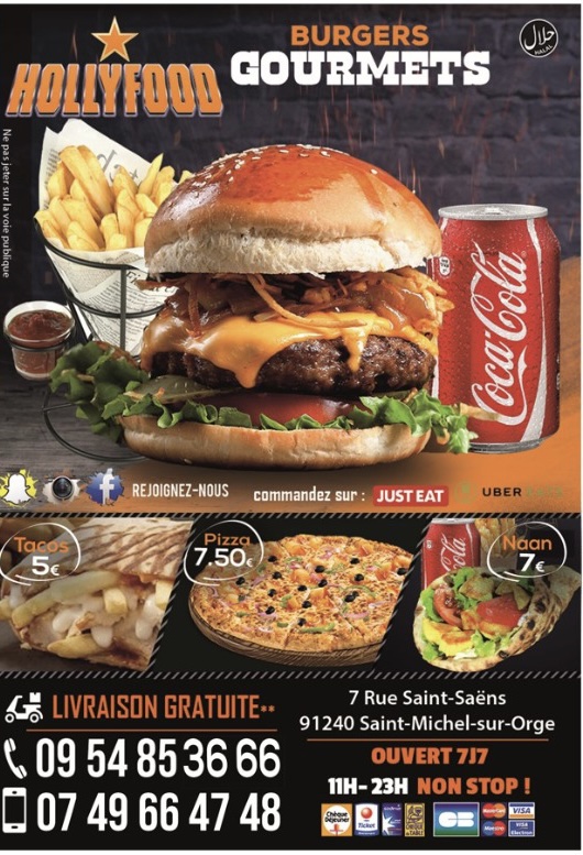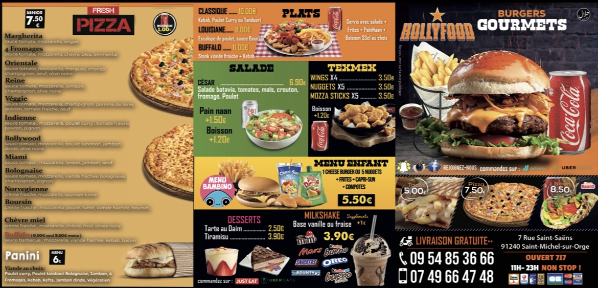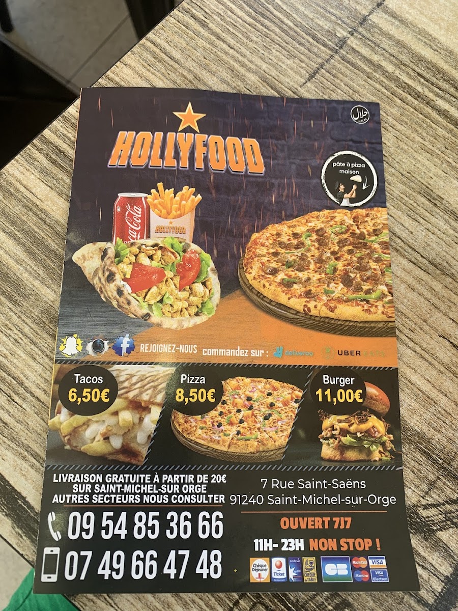 HOLLYFOOD, nestled in the heart of Saint-Michel-sur-Orge, is a fast food gem that blends quality and speed effortlessly. This restaurant offers a diverse menu featuring fresh, expertly prepared dishes that consistently impress. Customers praise the punctual service and the warm, welcoming atmosphere crafted by Abdel and his team. The highlight here is the finely cooked meats and the freshness of the ingredients, bringing a satisfying taste experience that keeps patrons coming back. The clean, inviting interior makes dining in a pleasure, while the attentive staff ensure every order is met with care and precision. HOLLYFOOD’s menu truly captures the essence of reliable, tasty fast food done right, providing a flavorful retreat from the everyday.